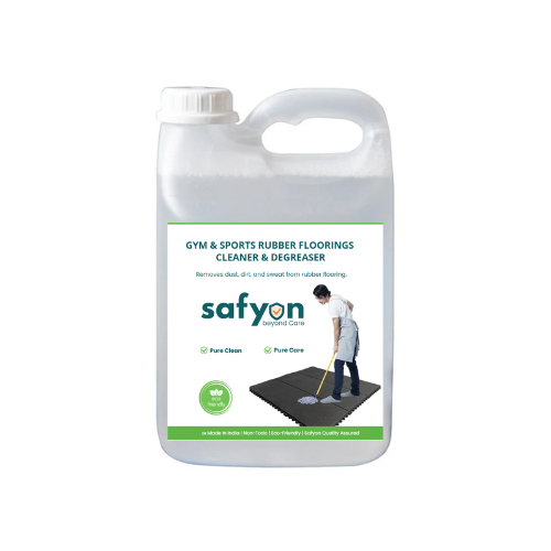 Safyon Rubber Floor Cleaner & Degreaser is specially designed to clean, degrease, and maintain rubber flooring. It removes oil, grease, sweat stains, dust, and stubborn marks from gym floors, EPDM sports flooring, rubber tiles, and rubber rolls.